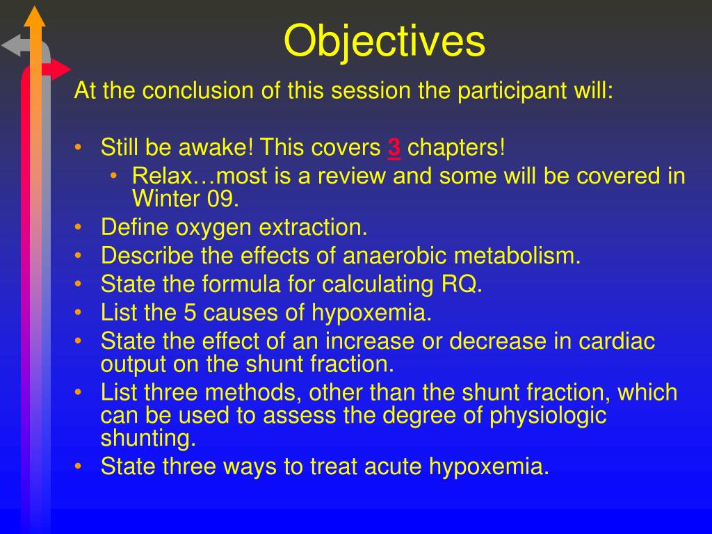 Objectives At the conclusion of this session the participant will: • Still be awake! This covers 3 chapters! • Relax…most is a review and some will be covered in Winter 09. • Define oxygen extraction. • Describe the effects of anaerobic metabolism. • State the formula for calculating RQ. • List the 5 causes of hypoxemia. • State the effect of an increase or decrease in cardiac output on the shunt fraction. • List three methods, other than the shunt fraction, which can be used to assess the degree of physiologic shunting. • State three ways to treat acute hypoxemia.