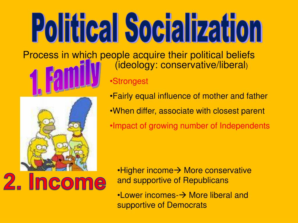 Political Socialization Process in which people acquire their political beliefs 1. Family (ideology: conservative/liberal) • Strongest • Fairly equal influence of mother and father • When differ, associate with closest parent • Impact of growing number of Independents • Higher income More conservative and supportive of Republicans • Lower incomes- More liberal and supportive of Democrats 2. Income