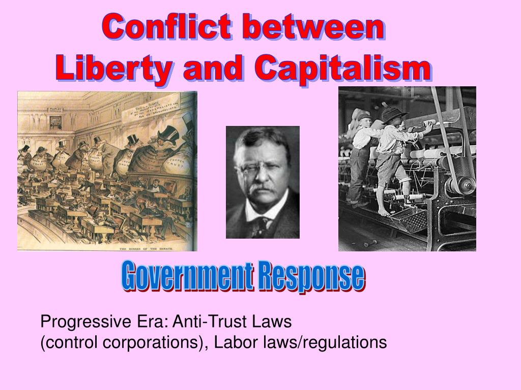 Conflict between Liberty and Capitalism Government Response Progressive Era: Anti-Trust Laws (control corporations), Labor laws/regulations