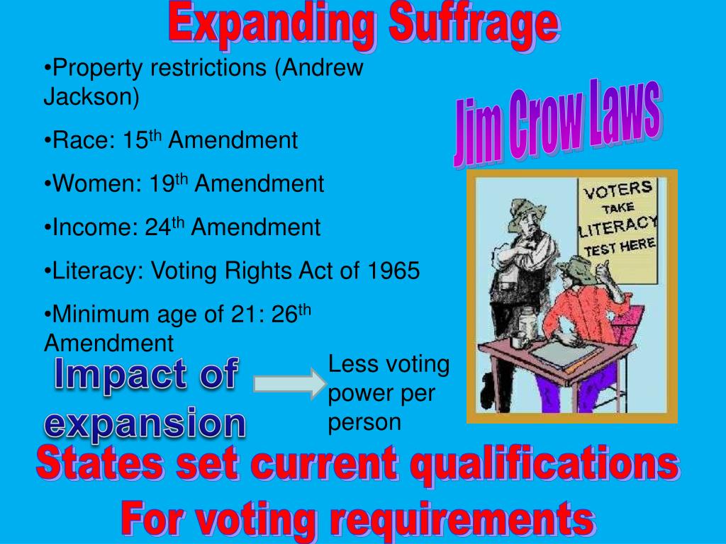 Expanding Suffrage • Property restrictions (Andrew Jackson) • Race: 15th Amendment • Women: 19th Amendment • Income: 24th Amendment • Literacy: Voting Rights Act of 1965 • Minimum age of 21: 26th Amendment Jim Crow Laws Impact of expansion Less voting power per person States set current qualifications For voting requirements