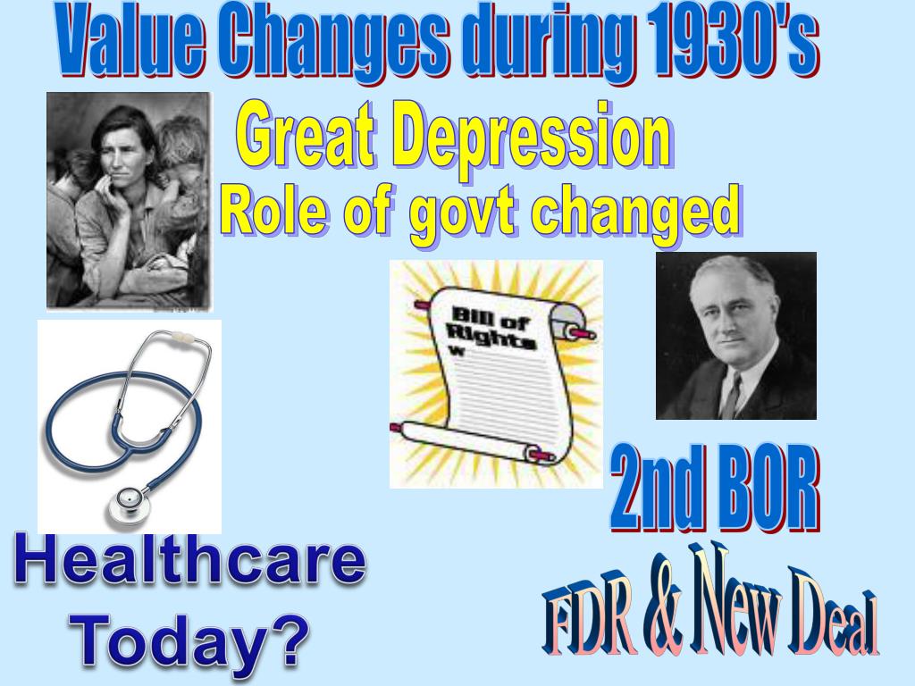 Value Changes during 1930's Great Depression Role of govt changed 2nd BOR Healthcare Today? FDR & New Deal