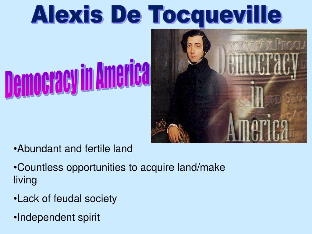 Alexis De Tocqueville Democracy in America • Abundant and fertile land • Countless opportunities to acquire land/make living • Lack of feudal society • Independent spirit