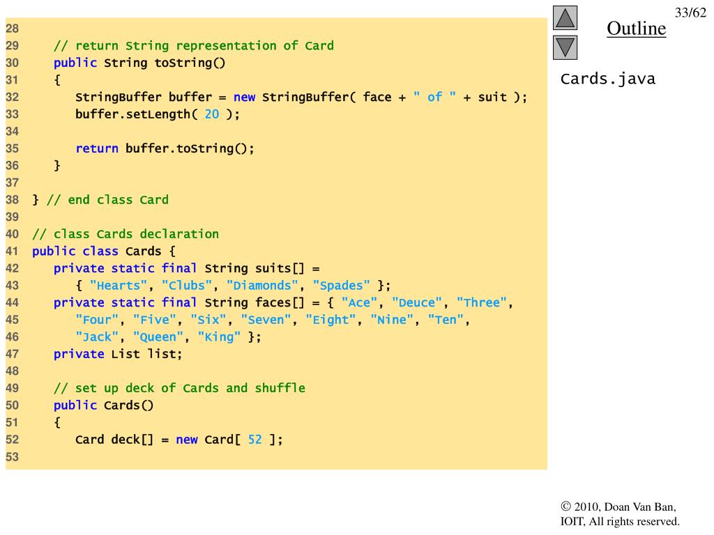 28 29 // return String representation of Card 30 public String toString() 31 { 32 StringBuffer buffer = new StringBuffer( face + " of " + suit ); 33 buffer.setLength( 20 ); 34 35 return buffer.toString(); 36 } 37 38 } // end class Card 39 40 // class Cards declaration 41 publicclass Cards { 42 privatestaticfinal String suits[] = 43 { "Hearts", "Clubs", "Diamonds", "Spades" }; 44 privatestaticfinal String faces[] = { "Ace", "Deuce", "Three", 45 "Four", "Five", "Six", "Seven", "Eight", "Nine", "Ten", 46 "Jack", "Queen", "King" }; 47 private List list; 48 49 // set up deck of Cards and shuffle 50 public Cards() 51 { 52 Card deck[] = new Card[ 52 ]; 53 Cards.java