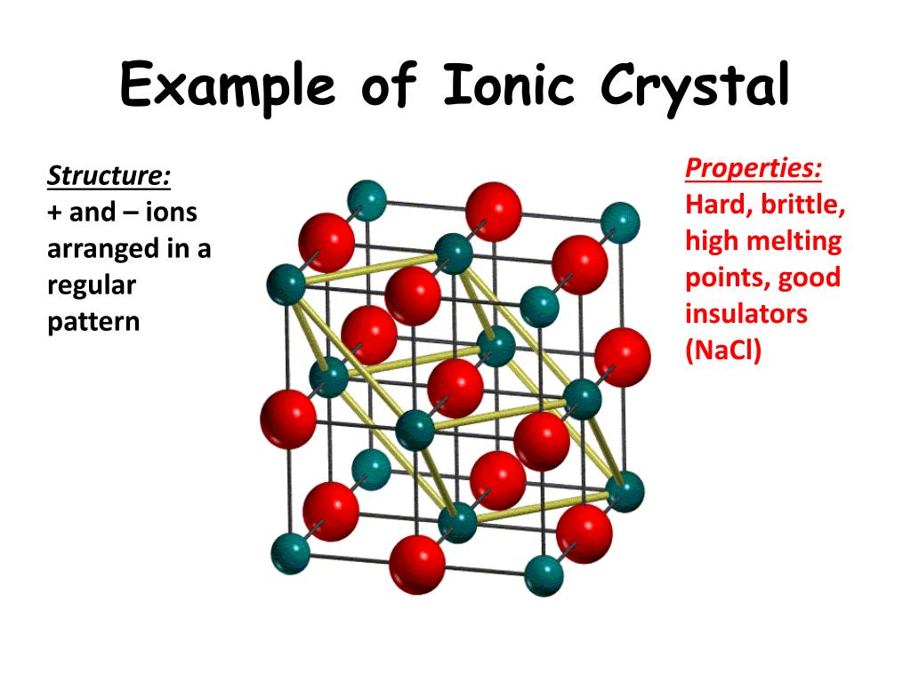 Example of Ionic Crystal Properties: Hard, brittle, high melting points, good insulators (NaCl) Structure: + and – ions arranged in a regular pattern