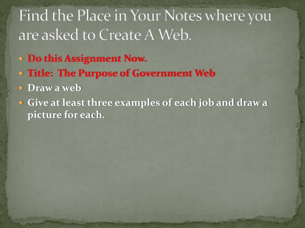 Find the Place in Your Notes where you are asked to Create A Web. • Do this Assignment Now. • Title: The Purpose of Government Web • Draw a web • Give at least three examples of each job and draw a picture for each.