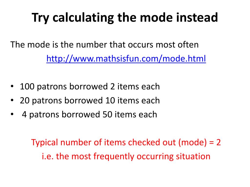Try calculating the mode instead The mode is the number that occurs most often http://www.mathsisfun.com/mode.html • 100 patrons borrowed 2 items each • 20 patrons borrowed 10 items each • 4 patrons borrowed 50 items each Typical number of items checked out (mode) = 2 i.e. the most frequently occurring situation