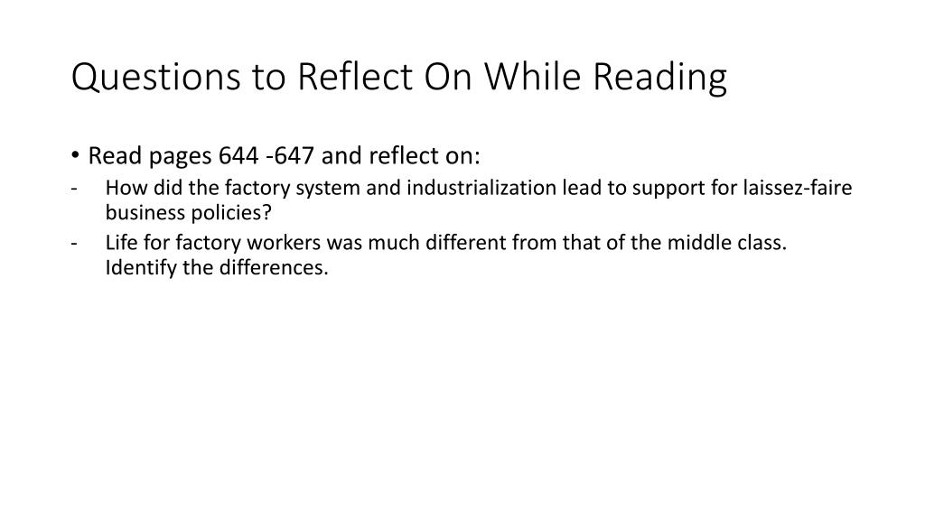 Questions to Reflect On While Reading • Read pages 644 -647 and reflect on: • How did the factory system and industrialization lead to support for laissez-faire business policies? • Life for factory workers was much different from that of the middle class. Identify the differences.