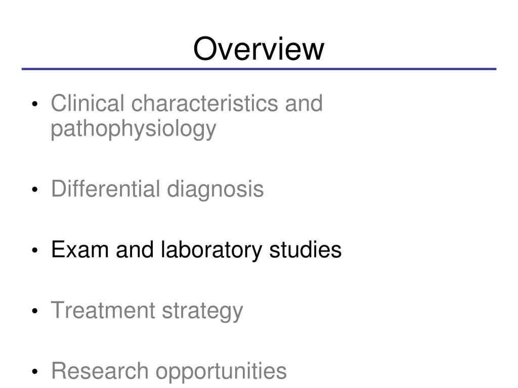 Overview • Clinical characteristics and pathophysiology • Differential diagnosis • Exam and laboratory studies • Treatment strategy • Research opportunities