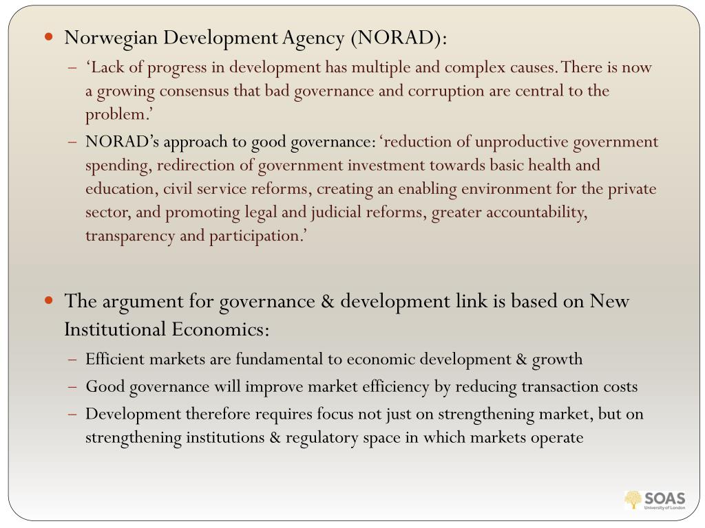 Norwegian Development Agency (NORAD): • ‘Lack of progress in development has multiple and complex causes. There is now a growing consensus that bad governance and corruption are central to the problem.’ • NORAD’s approach to good governance: ‘reduction of unproductive government spending, redirection of government investment towards basic health and education, civil service reforms, creating an enabling environment for the private sector, and promoting legal and judicial reforms, greater accountability, transparency and participation.’ • The argument for governance & development link is based on New Institutional Economics: • Efficient markets are fundamental to economic development & growth • Good governance will improve market efficiency by reducing transaction costs • Development therefore requires focus not just on strengthening market, but on strengthening institutions & regulatory space in which markets operate