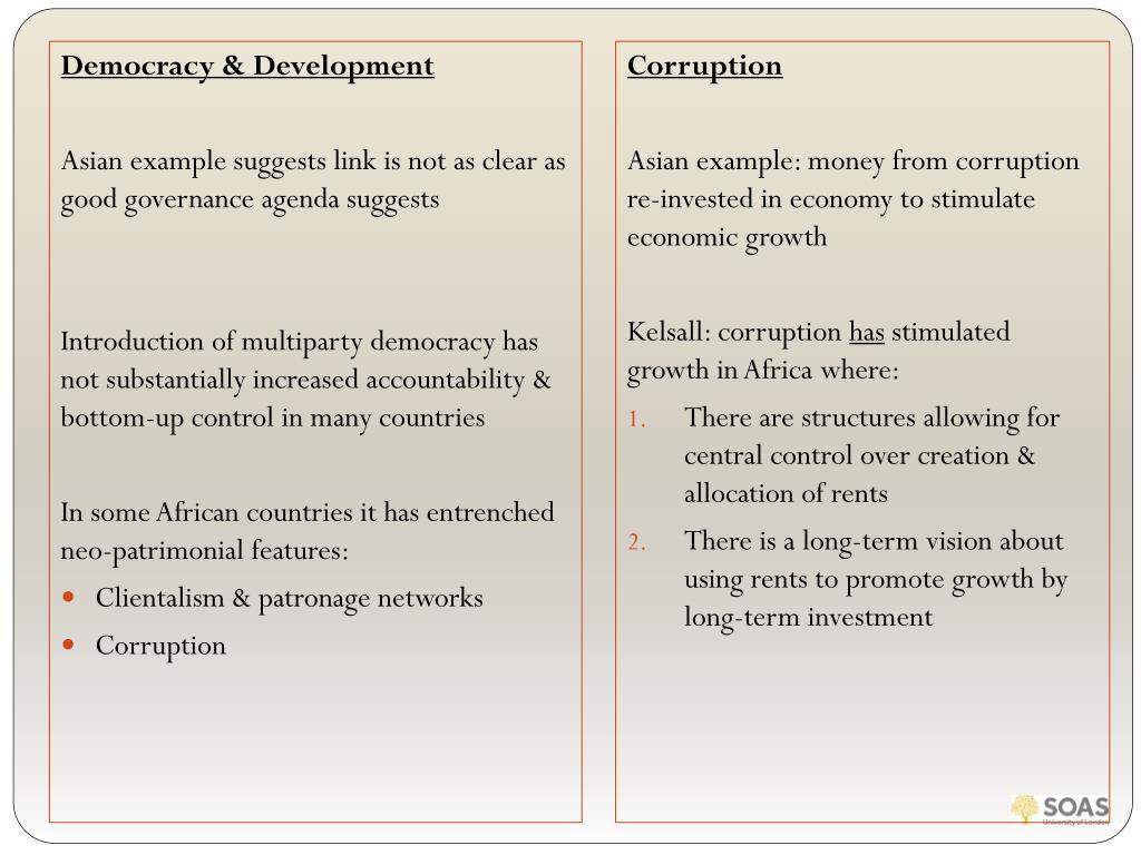 Democracy & Development Asian example suggests link is not as clear as good governance agenda suggests Introduction of multiparty democracy has not substantially increased accountability & bottom-up control in many countries In some African countries it has entrenched neo-patrimonial features: Clientalism & patronage networks Corruption Corruption Asian example: money from corruption re-invested in economy to stimulate economic growth Kelsall: corruption has stimulated growth in Africa where: There are structures allowing for central control over creation & allocation of rents There is a long-term vision about using rents to promote growth by long-term investment