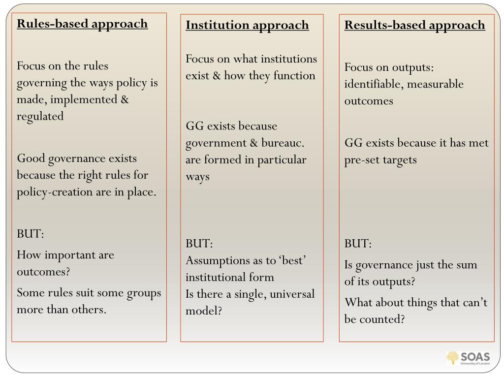 Institution approach Focus on what institutions exist & how they function GG exists because government & bureauc. are formed in particular ways BUT: Assumptions as to ‘best’ institutional form Is there a single, universal model? Results-based approach Focus on outputs: identifiable, measurable outcomes GG exists because it has met pre-set targets BUT: Is governance just the sum of its outputs? What about things that can’t be counted? Rules-based approach Focus on the rules governing the ways policy is made, implemented & regulated Good governance exists because the right rules for policy-creation are in place. BUT: How important are outcomes? Some rules suit some groups more than others.