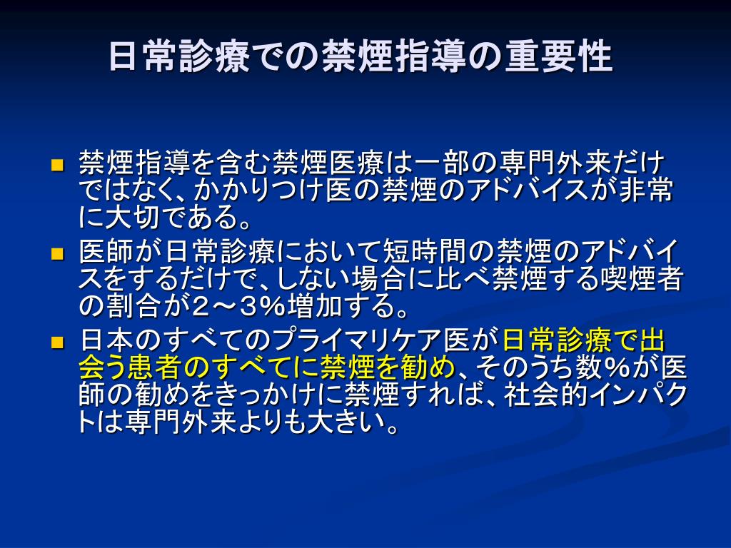 日常診療での禁煙指導の重要性 • 禁煙指導を含む禁煙医療は一部の専門外来だけではなく、かかりつけ医の禁煙のアドバイスが非常に大切である。 • 医師が日常診療において短時間の禁煙のアドバイスをするだけで、しない場合に比べ禁煙する喫煙者の割合が2~3%増加する。 • 日本のすべてのプライマリケア医が日常診療で出会う患者のすべてに禁煙を勧め、そのうち数%が医師の勧めをきっかけに禁煙すれば、社会的インパクトは専門外来よりも大きい。