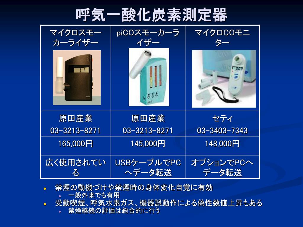 呼気一酸化炭素測定器 • 禁煙の動機づけや禁煙時の身体変化自覚に有効 • 一般外来でも有用 • 受動喫煙、呼気水素ガス、機器誤動作による偽性数値上昇もある • 禁煙継続の評価は総合的に行う