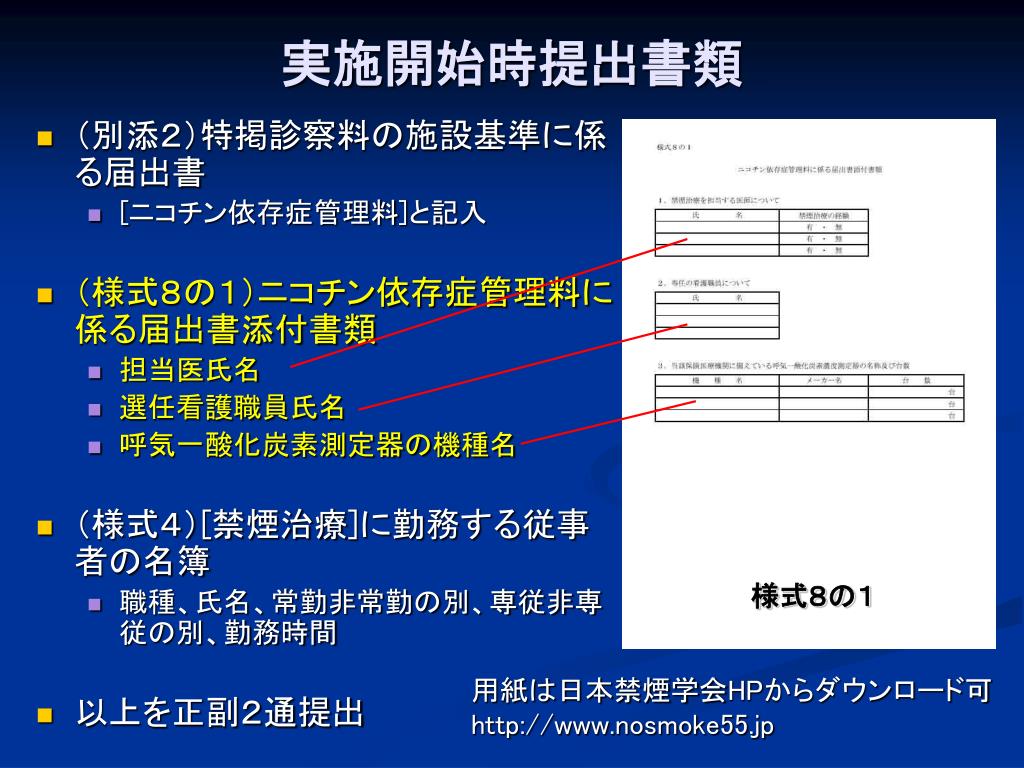 様式8の1 実施開始時提出書類 • (別添2)特掲診察料の施設基準に係る届出書 • [ニコチン依存症管理料]と記入 • (様式8の1)ニコチン依存症管理料に係る届出書添付書類 • 担当医氏名 • 選任看護職員氏名 • 呼気一酸化炭素測定器の機種名 • (様式4)[禁煙治療]に勤務する従事者の名簿 • 職種、氏名、常勤非常勤の別、専従非専従の別、勤務時間 • 以上を正副2通提出 用紙は日本禁煙学会HPからダウンロード可 http://www.nosmoke55.jp