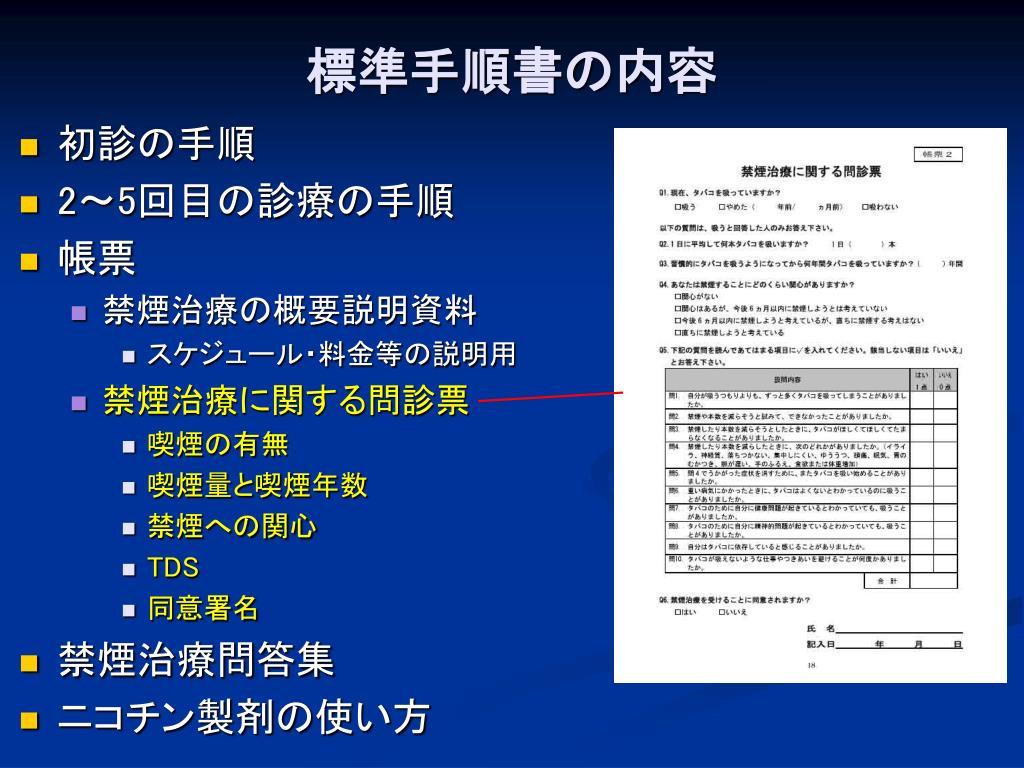 標準手順書の内容 • 初診の手順 • 2~5回目の診療の手順 • 帳票 • 禁煙治療の概要説明資料 • スケジュール・料金等の説明用 • 禁煙治療に関する問診票 • 喫煙の有無 • 喫煙量と喫煙年数 • 禁煙への関心 • TDS • 同意署名 • 禁煙治療問答集 • ニコチン製剤の使い方