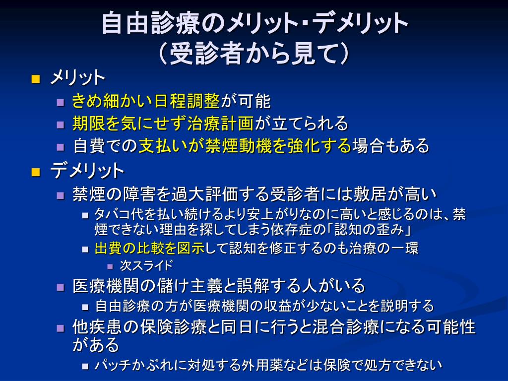 自由診療のメリット・デメリット(受診者から見て)自由診療のメリット・デメリット(受診者から見て) • メリット • きめ細かい日程調整が可能 • 期限を気にせず治療計画が立てられる • 自費での支払いが禁煙動機を強化する場合もある • デメリット • 禁煙の障害を過大評価する受診者には敷居が高い • タバコ代を払い続けるより安上がりなのに高いと感じるのは、禁煙できない理由を探してしまう依存症の「認知の歪み」 • 出費の比較を図示して認知を修正するのも治療の一環 • 次スライド • 医療機関の儲け主義と誤解する人がいる • 自由診療の方が医療機関の収益が少ないことを説明する • 他疾患の保険診療と同日に行うと混合診療になる可能性がある • パッチかぶれに対処する外用薬などは保険で処方できない