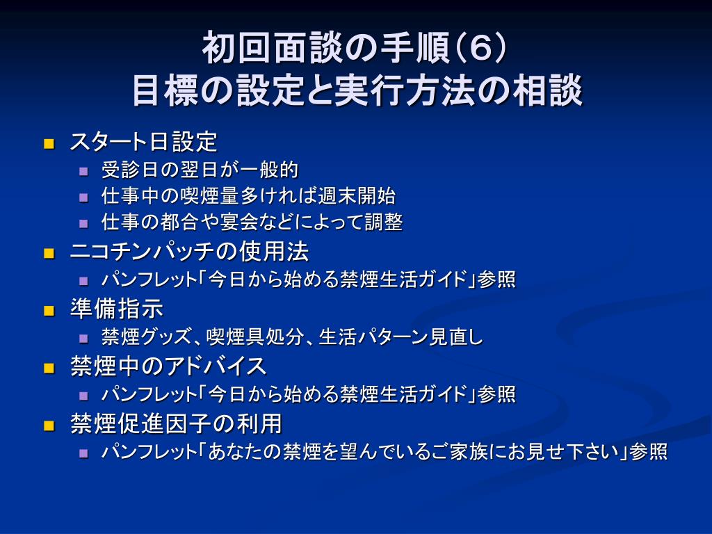 初回面談の手順(6)目標の設定と実行方法の相談初回面談の手順(6)目標の設定と実行方法の相談 • スタート日設定 • 受診日の翌日が一般的 • 仕事中の喫煙量多ければ週末開始 • 仕事の都合や宴会などによって調整 • ニコチンパッチの使用法 • パンフレット「今日から始める禁煙生活ガイド」参照 • 準備指示 • 禁煙グッズ、喫煙具処分、生活パターン見直し • 禁煙中のアドバイス • パンフレット「今日から始める禁煙生活ガイド」参照 • 禁煙促進因子の利用 • パンフレット「あなたの禁煙を望んでいるご家族にお見せ下さい」参照