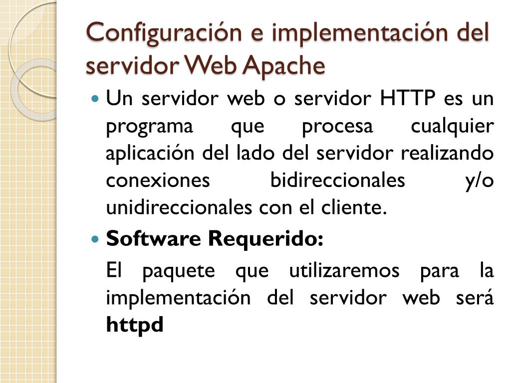Configuración e implementación del servidor Web Apache • Un servidor web o servidor HTTP es un programa que procesa cualquier aplicación del lado del servidor realizando conexiones bidireccionales y/o unidireccionales con el cliente. • Software Requerido: El paquete que utilizaremos para la implementación del servidor web será httpd
