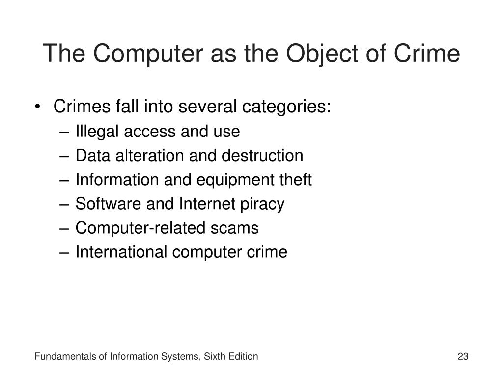 The Computer as the Object of Crime • Crimes fall into several categories: • Illegal access and use • Data alteration and destruction • Information and equipment theft • Software and Internet piracy • Computer-related scams • International computer crime Fundamentals of Information Systems, Sixth Edition