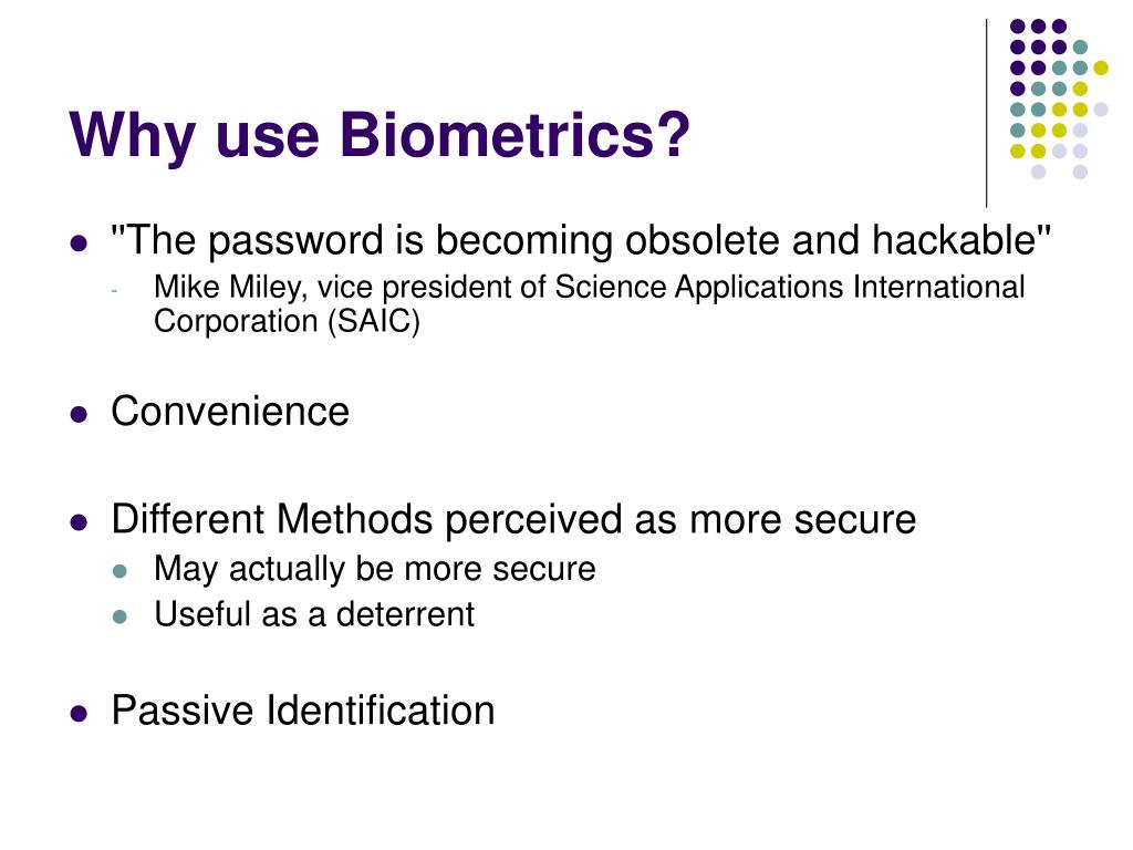 Why use Biometrics? • ''The password is becoming obsolete and hackable'' • Mike Miley, vice president of Science Applications International Corporation (SAIC) • Convenience • Different Methods perceived as more secure • May actually be more secure • Useful as a deterrent • Passive Identification