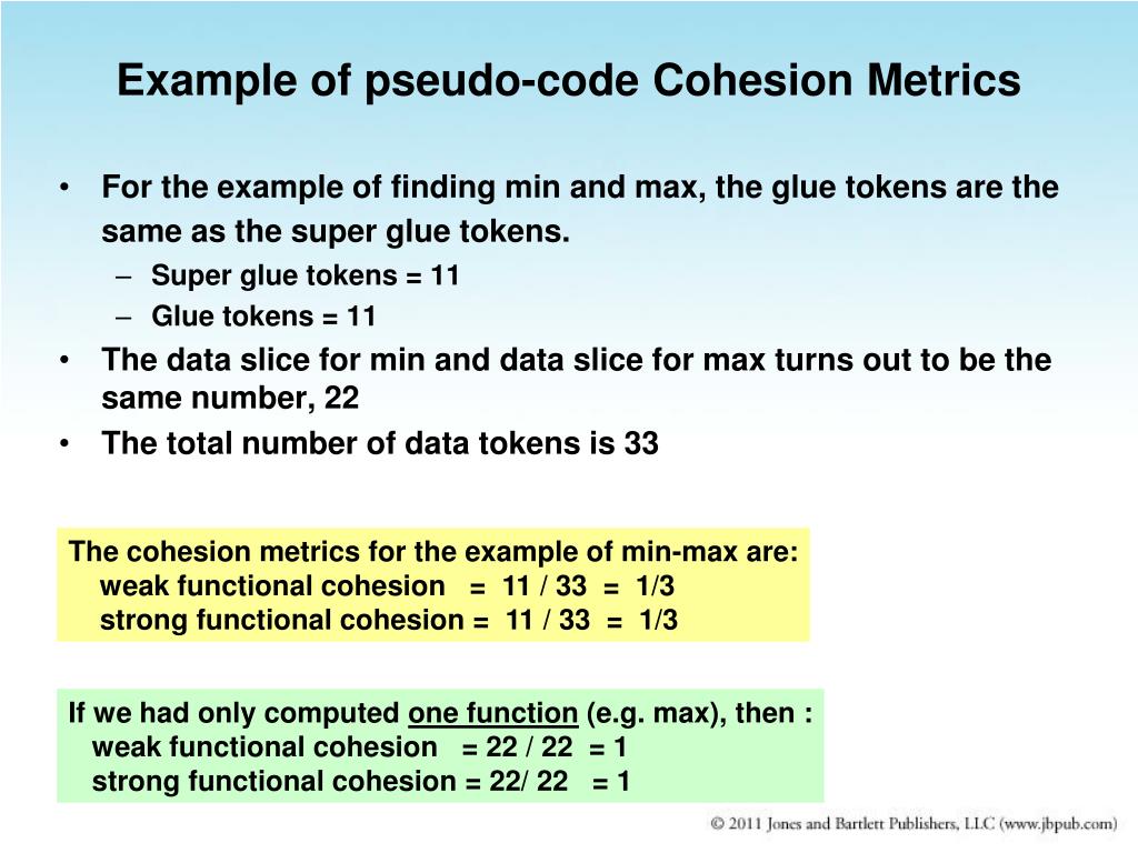 Example of pseudo-code Cohesion Metrics • For the example of finding min and max, the glue tokens are the same as the super glue tokens. • Super glue tokens = 11 • Glue tokens = 11 • The data slice for min and data slice for max turns out to be the same number, 22 • The total number of data tokens is 33 The cohesion metrics for the example of min-max are: weak functional cohesion = 11 / 33 = 1/3 strong functional cohesion = 11 / 33 = 1/3 If we had only computed one function (e.g. max), then : weak functional cohesion = 22 / 22 = 1 strong functional cohesion = 22/ 22 = 1