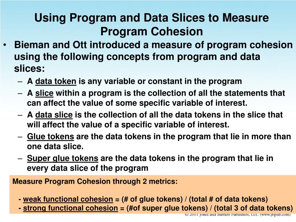 Using Program and Data Slices to Measure Program Cohesion • Bieman and Ott introduced a measure of program cohesion using the following concepts from program and data slices: • A data token is any variable or constant in the program • A slice within a program is the collection of all the statements that can affect the value of some specific variable of interest. • A data slice is the collection of all the data tokens in the slice that will affect the value of a specific variable of interest. • Glue tokens are the data tokens in the program that lie in more than one data slice. • Super glue tokens are the data tokens in the program that lie in every data slice of the program Measure Program Cohesion through 2 metrics: - weak functional cohesion = (# of glue tokens) / (total # of data tokens) - strong functional cohesion = (#of super glue tokens) / (total 3 of data tokens)