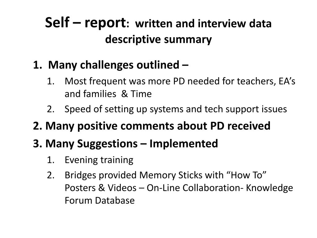 Self – report: written and interview data descriptive summary 1. Many challenges outlined – • Most frequent was more PD needed for teachers, EA’s and families & Time • Speed of setting up systems and tech support issues 2. Many positive comments about PD received 3. Many Suggestions – Implemented • Evening training • Bridges provided Memory Sticks with “How To” Posters & Videos – On-Line Collaboration- Knowledge Forum Database
