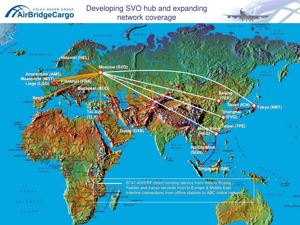 Developing SVO hub and expanding network coverage Helsinki (HEL) Moscow (SVO) Amsterdam (AMS) Maastricht (MST) Frankfurt (FRA) Liege (LGG) Budapest (BUD) Beijing (PEK) Spain Seoul (ICN) Tokyo (NRT) Tel-Aviv (TLV) Shanghai (PVG) Taipei (TPE) Hong Kong (HKG) Dubai (DXB) Ho Chi Minh (SGN) Singapore (SIN) B747-400ERF direct nonstop service from Asia to Russia Feeder and transit services from/to Europe & Middle East Interline connections from offline stations to ABC online network