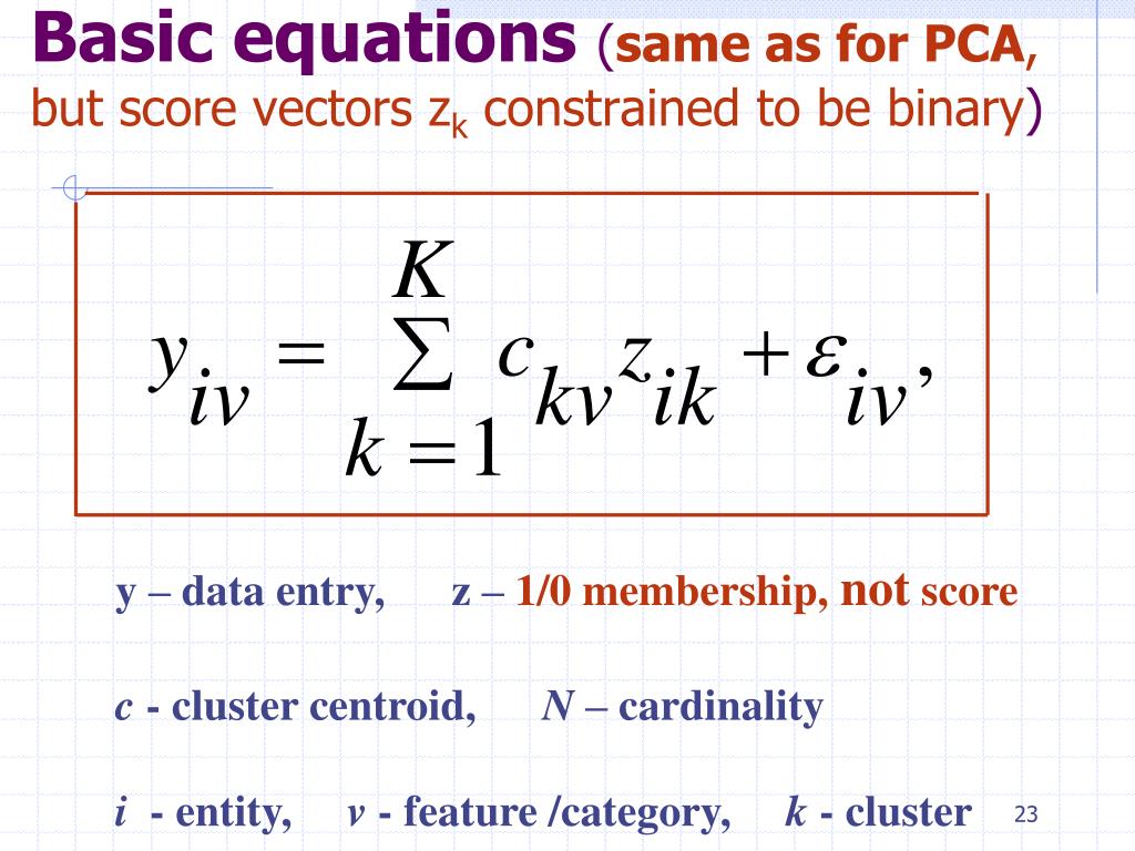 Basic equations (same as for PCA, but score vectors zk constrained to be binary) y – data entry, z – 1/0 membership, not score c - cluster centroid, N – cardinality i - entity, v - feature /category, k - cluster