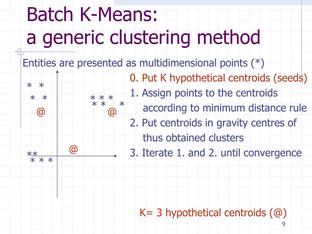 Batch K-Means: a generic clustering method Entities are presented as multidimensional points (*) 0. Put K hypothetical centroids (seeds) 1. Assign points to the centroids according to minimum distance rule 2. Put centroids in gravity centres of thus obtained clusters 3. Iterate 1. and 2. until convergence K= 3 hypothetical centroids (@) • * * • * * * * * • * * * • @ @ • @ • ** • * * *