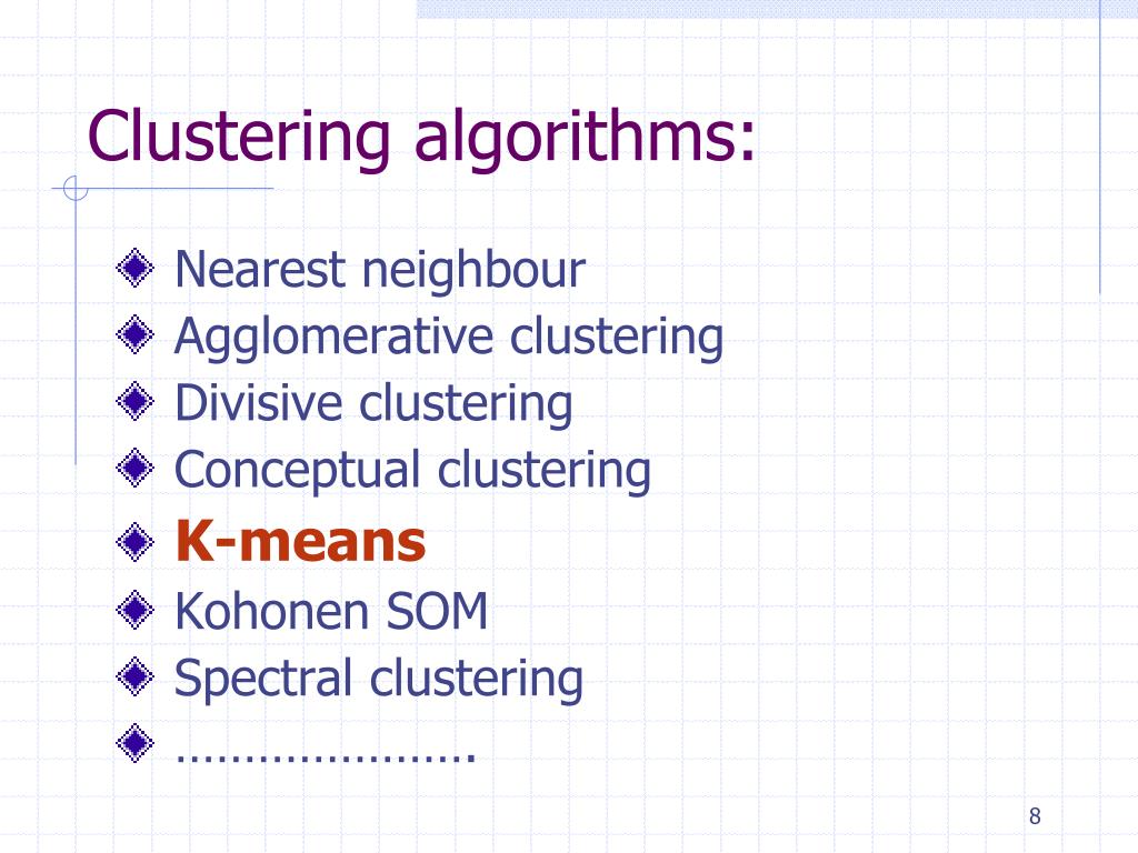 Clustering algorithms: • Nearest neighbour • Agglomerative clustering • Divisive clustering • Conceptual clustering • K-means • Kohonen SOM • Spectral clustering • ………………….