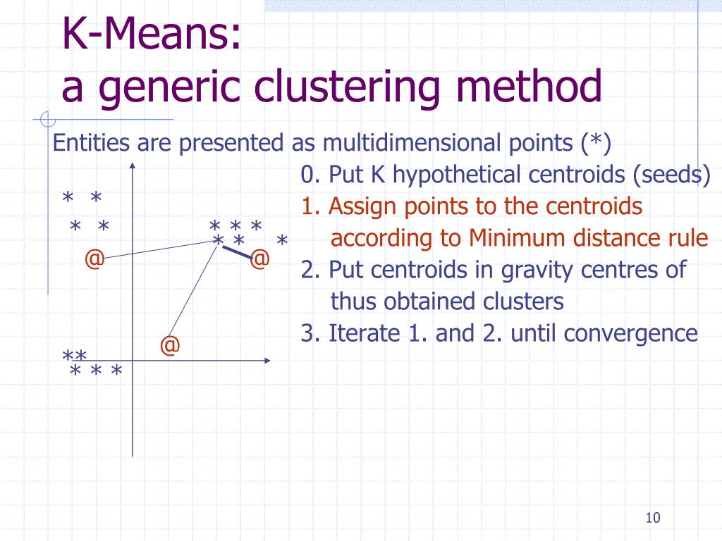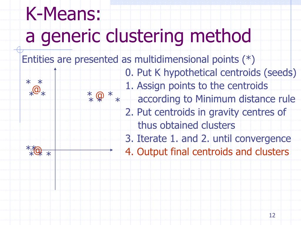 K-Means: a generic clustering method Entities are presented as multidimensional points (*) 0. Put K hypothetical centroids (seeds) 1. Assign points to the centroids according to Minimum distance rule 2. Put centroids in gravity centres of thus obtained clusters 3. Iterate 1. and 2. until convergence • * * • * * * * * • * * * • @ @ • @ • ** • * * *