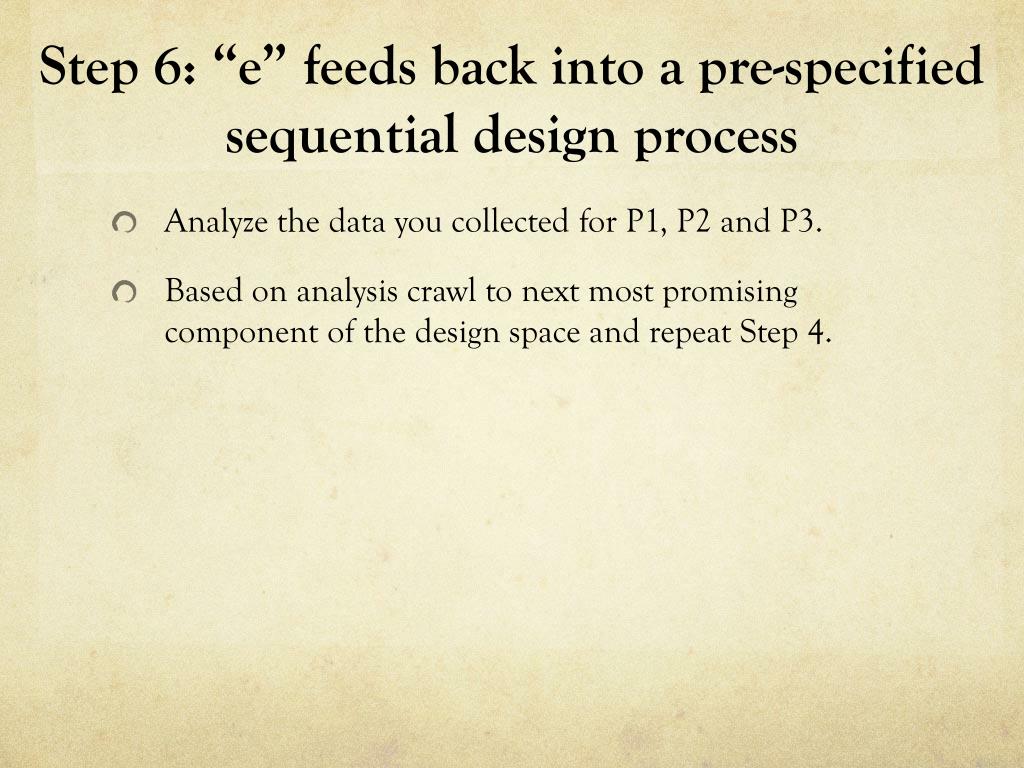 Step 6: “e” feeds back into a pre-specified sequential design process • Analyze the data you collected for P1, P2 and P3. • Based on analysis crawl to next most promising component of the design space and repeat Step 4.