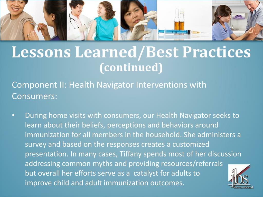 Lessons Learned/Best Practices(continued) Component II: Health Navigator Interventions with Consumers: • During home visits with consumers, our Health Navigator seeks to learn about their beliefs, perceptions and behaviors around immunization for all members in the household. She administers a survey and based on the responses creates a customized presentation. In many cases, Tiffany spends most of her discussion addressing common myths and providing resources/referrals but overall her efforts serve as a catalyst for adults to improve child and adult immunization outcomes.