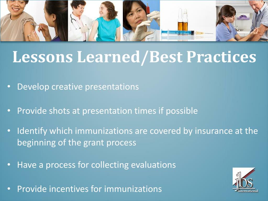 Lessons Learned/Best Practices • Develop creative presentations • Provide shots at presentation times if possible • Identify which immunizations are covered by insurance at the beginning of the grant process • Have a process for collecting evaluations • Provide incentives for immunizations