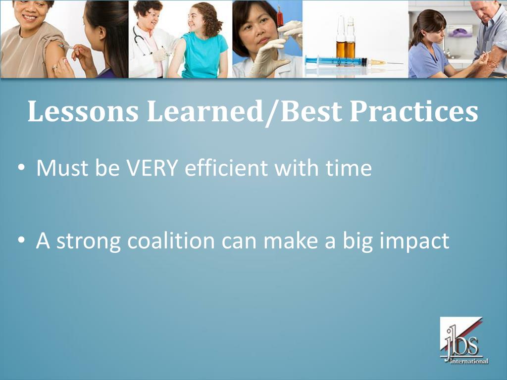 Lessons Learned/Best Practices • Must be VERY efficient with time • A strong coalition can make a big impact