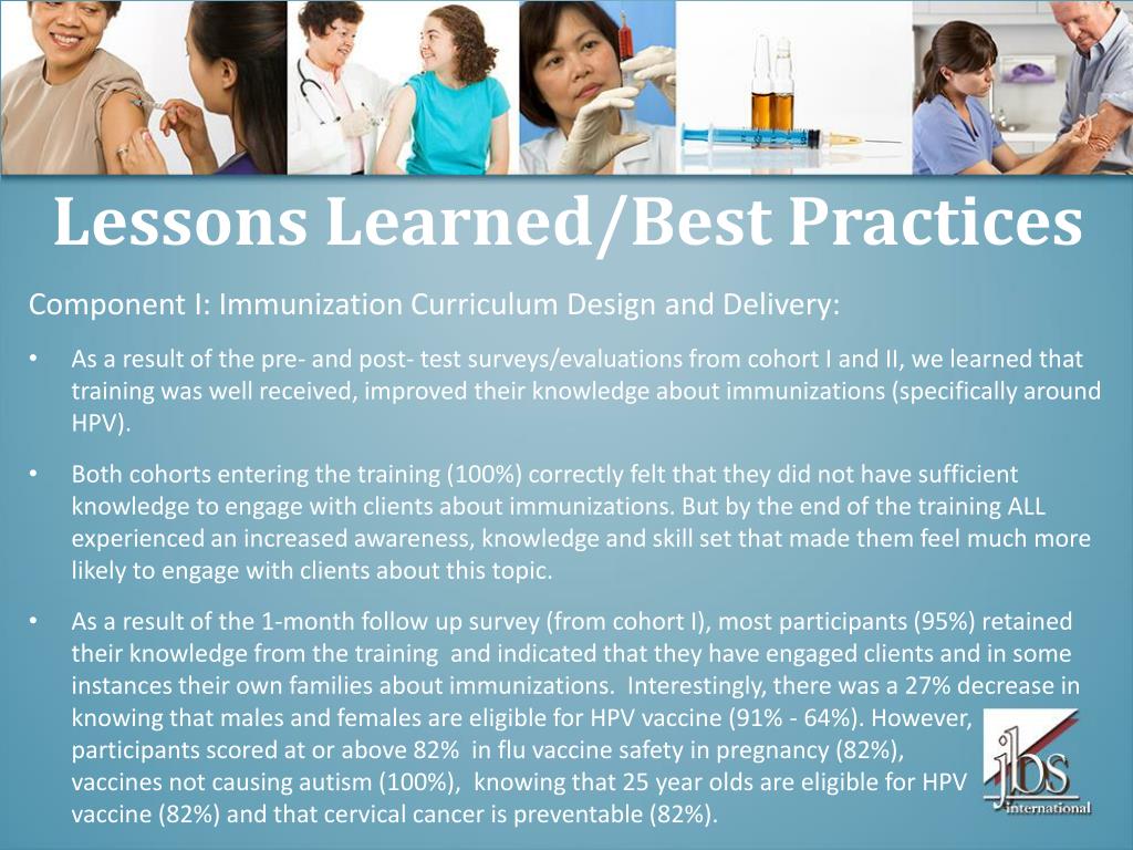 Lessons Learned/Best Practices Component I: Immunization Curriculum Design and Delivery: • As a result of the pre- and post- test surveys/evaluations from cohort I and II, we learned that training was well received, improved their knowledge about immunizations (specifically around HPV). • Both cohorts entering the training (100%) correctly felt that they did not have sufficient knowledge to engage with clients about immunizations. But by the end of the training ALL experienced an increased awareness, knowledge and skill set that made them feel much more likely to engage with clients about this topic. • As a result of the 1-month follow up survey (from cohort I), most participants (95%) retained their knowledge from the training and indicated that they have engaged clients and in some instances their own families about immunizations. Interestingly, there was a 27% decrease in knowing that males and females are eligible for HPV vaccine (91% - 64%). However, participants scored at or above 82% in flu vaccine safety in pregnancy (82%), vaccines not causing autism (100%), knowing that 25 year olds are eligible for HPV vaccine (82%) and that cervical cancer is preventable (82%).