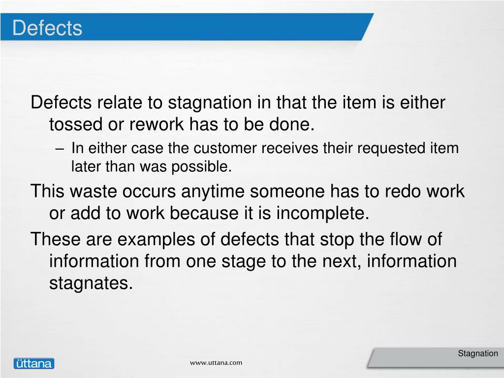 Defects • Defects relate to stagnation in that the item is either tossed or rework has to be done. • In either case the customer receives their requested item later than was possible. • This waste occurs anytime someone has to redo work or add to work because it is incomplete. • These are examples of defects that stop the flow of information from one stage to the next, information stagnates. www.uttana.com