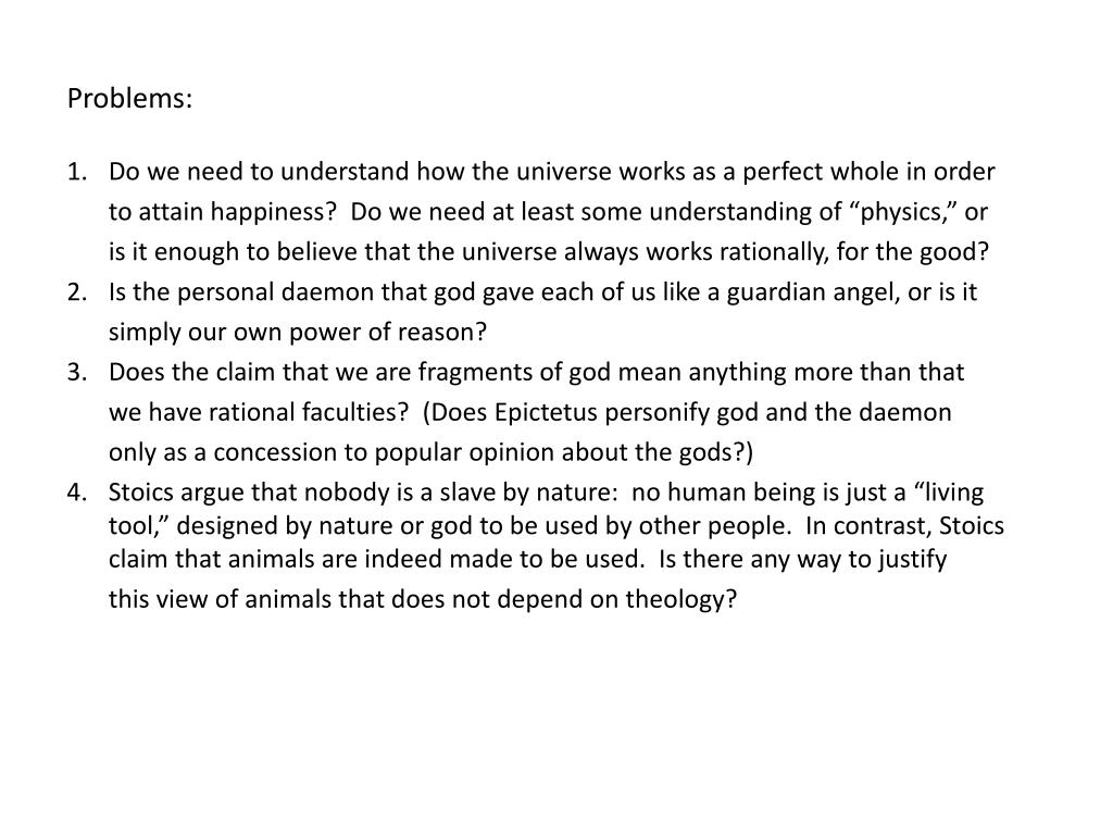 Problems: • Do we need to understand how the universe works as a perfect whole in order to attain happiness? Do we need at least some understanding of “physics,” or is it enough to believe that the universe always works rationally, for the good? • Is the personal daemon that god gave each of us like a guardian angel, or is it simply our own power of reason? • Does the claim that we are fragments of god mean anything more than that we have rational faculties? (Does Epictetus personify god and the daemon only as a concession to popular opinion about the gods?) • Stoics argue that nobody is a slave by nature: no human being is just a “living tool,” designed by nature or god to be used by other people. In contrast, Stoics claim that animals are indeed made to be used. Is there any way to justify this view of animals that does not depend on theology?