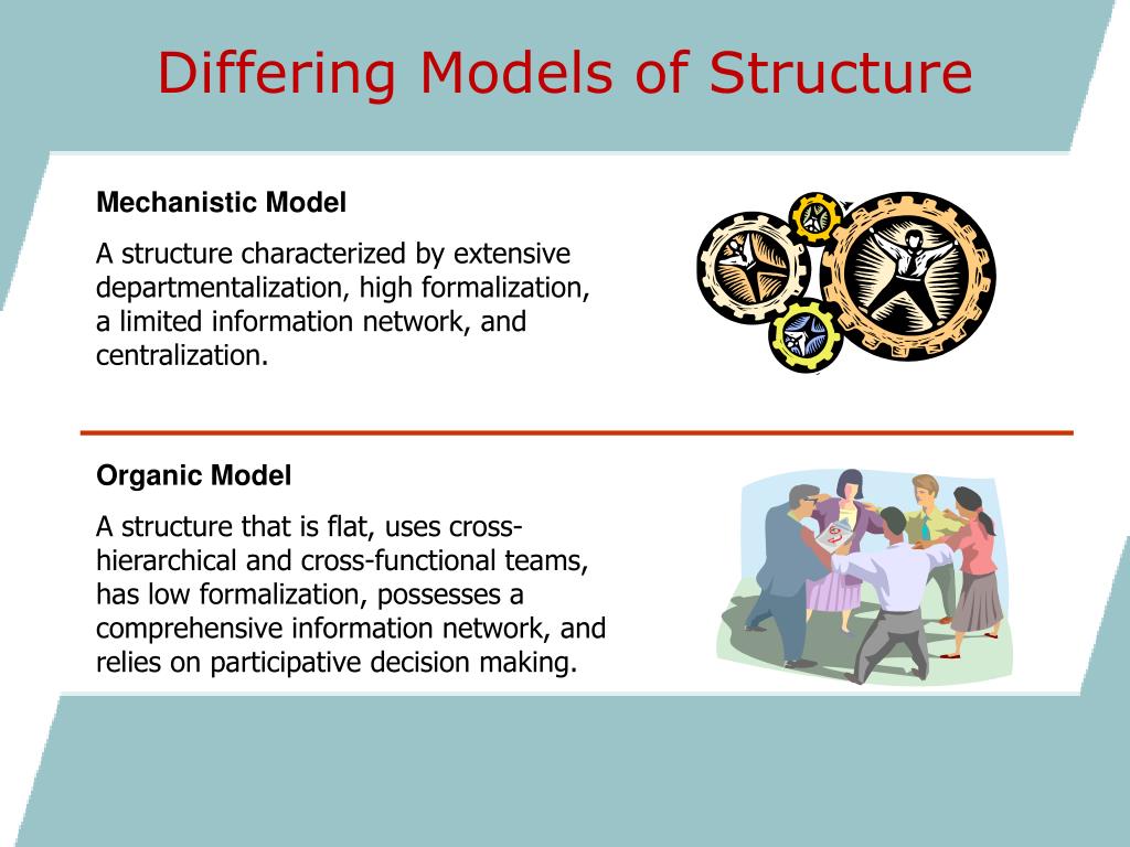 Differing Models of Structure Mechanistic Model A structure characterized by extensive departmentalization, high formalization, a limited information network, and centralization. Organic Model A structure that is flat, uses cross-hierarchical and cross-functional teams, has low formalization, possesses a comprehensive information network, and relies on participative decision making.