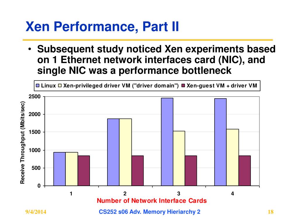 Xen Performance, Part II • Subsequent study noticed Xen experiments based on 1 Ethernet network interfaces card (NIC), and single NIC was a performance bottleneck CS252 s06 Adv. Memory Hieriarchy 2