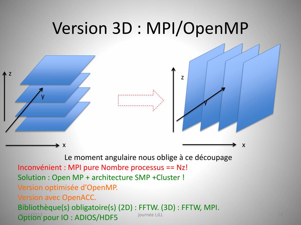 Version 3D : MPI/OpenMP z z y y x x Le moment angulaire nous oblige à ce découpage Inconvénient : MPI pure Nombre processus == Nz! Solution : Open MP + architecture SMP +Cluster ! Version optimisée d’OpenMP. Version avec OpenACC. Bibliothèque(s) obligatoire(s) (2D) : FFTW. (3D) : FFTW, MPI. Option pour IO : ADIOS/HDF5 journée LJLL
