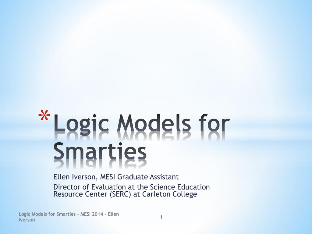 Logic Models for Smarties Ellen Iverson, MESI Graduate Assistant Director of Evaluation at the Science Education Resource Center (SERC) at Carleton College Logic Models for Smarties - MESI 2014 - Ellen Iverson