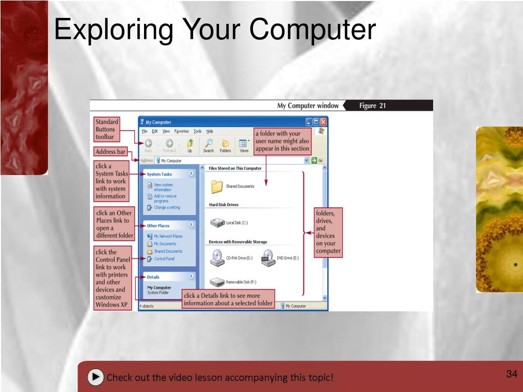 Objectives Navigate your computer with Windows Explorer and My Computer Change the view of the items in your computer Get help when you need it Shut down Windows