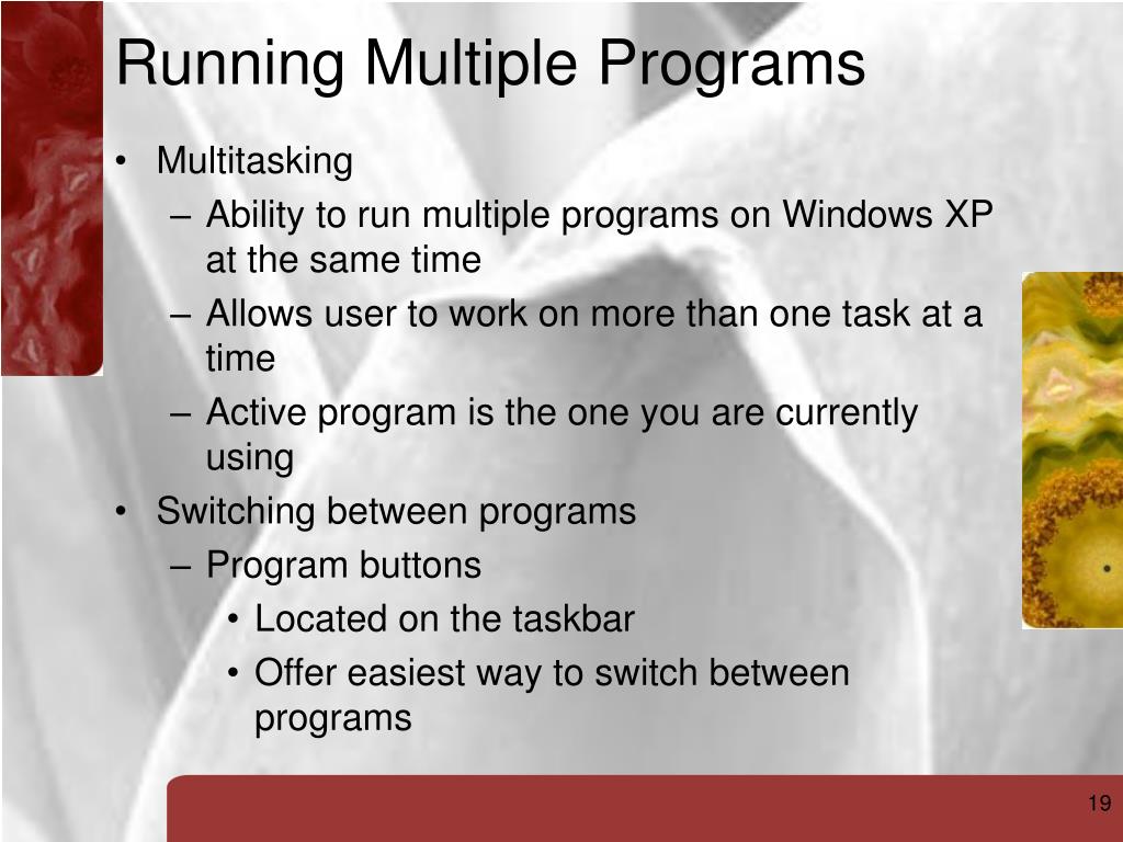 Running Multiple Programs Multitasking Ability to run multiple programs on Windows XP at the same time Allows user to work on more than one task at a time Active program is the one you are currently using Switching between programs Program buttons Located on the taskbar Offer easiest way to switch between programs