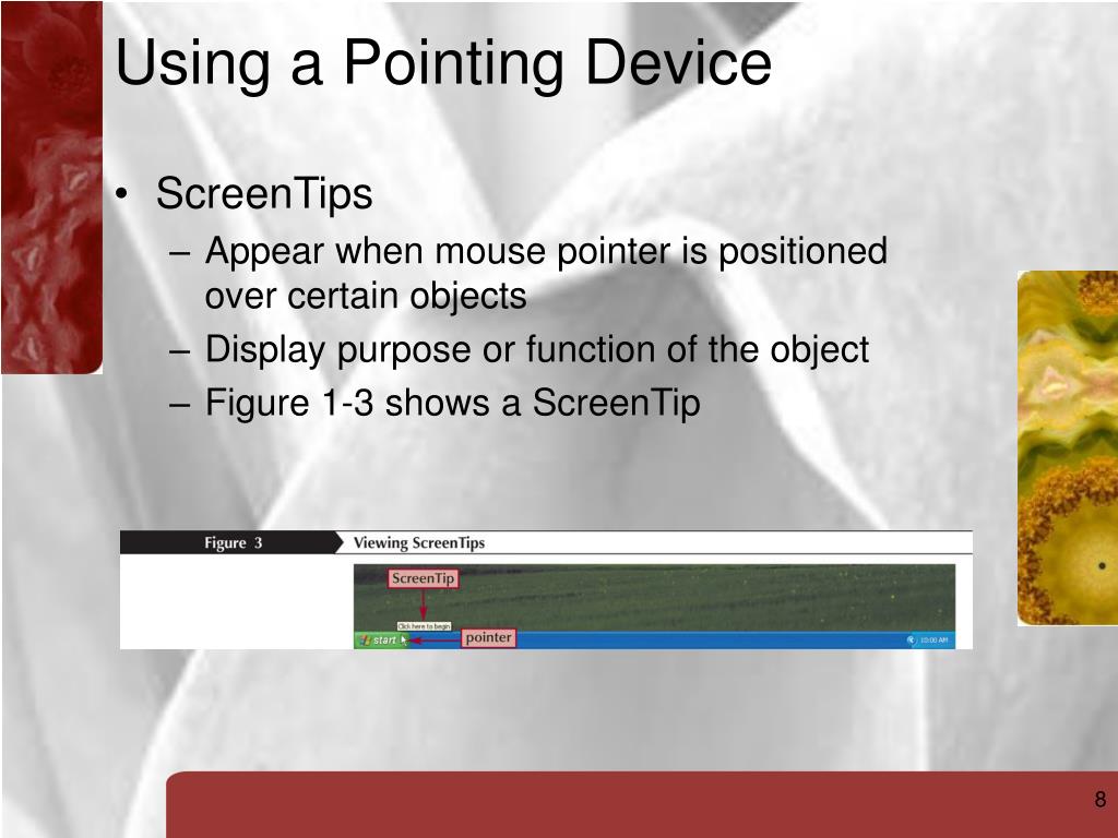 Using a Pointing Device ScreenTips Appear when mouse pointer is positioned over certain objects Display purpose or function of the object Figure 1-3 shows a ScreenTip