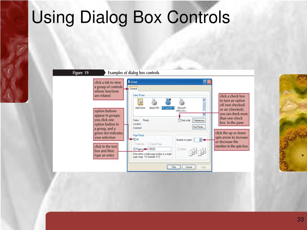 Using Dialog Box Controls Dialog box Opens when a menu command or item followed by an ellipsis is selected Allows the user to provide more information about how a program should carry out a task Groups different kinds of information in panes Panes: bordered rectangular areas