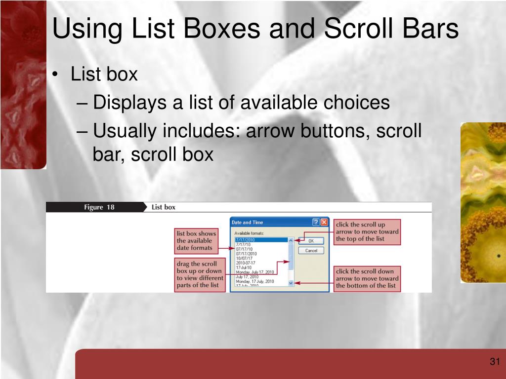 Using List Boxes and Scroll Bars List box Displays a list of available choices Usually includes: arrow buttons, scroll bar, scroll box