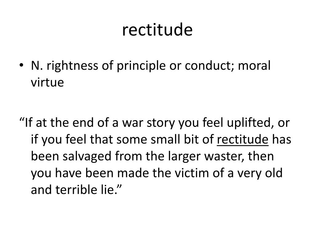 rectitude • N. rightness of principle or conduct; moral virtue “If at the end of a war story you feel uplifted, or if you feel that some small bit of rectitude has been salvaged from the larger waster, then you have been made the victim of a very old and terrible lie.”