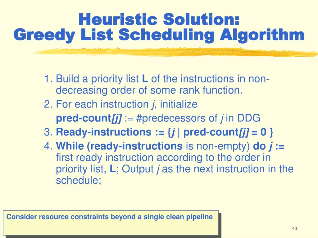 Heuristic Solution:Greedy List Scheduling Algorithm 1. Build a priority list L of the instructions in non-decreasing order of some rank function. 2. For each instruction j, initialize pred-count[j] := #predecessors of j in DDG 3. Ready-instructions := {j | pred-count[j] = 0 } 4. While (ready-instructions is non-empty) doj:= first ready instruction according to the order in priority list, L; Output j as the next instruction in the schedule; Consider resource constraints beyond a single clean pipeline \course\cpeg421-10F\Topic2a.ppt